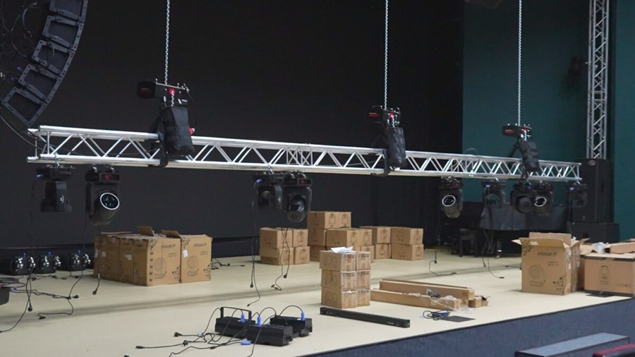 В зале уже установили специальные металлические фермы с лебедками, на которые крепится оборудование. Сейчас специалисты монтируют прожекторы и продолжают настройку техники.